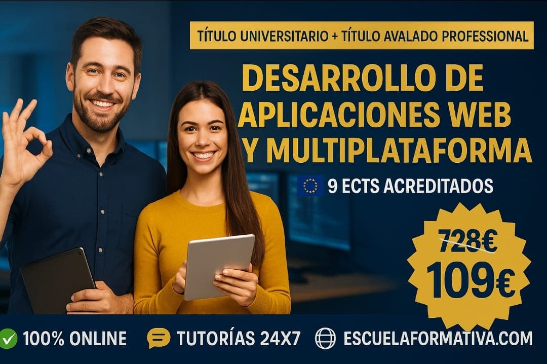 DOBLE TITULACIÓN ~ UNIVERSITARIA + PROFESIONAL: APLICACIÓN WEB Y MULTIPLATAFORMA (9 ECTS) + TÉCNICO SUPERIOR PROFESIONAL EN DESARROLLO DE APLICACIONES WEB Y MULTIPLATAFORMA