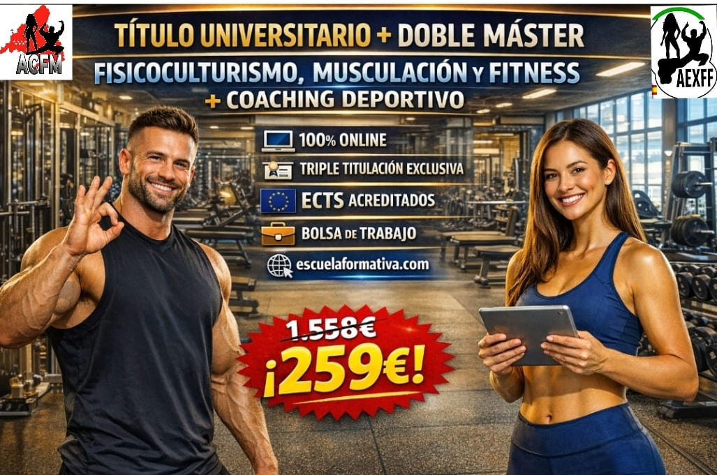 CURSO UNIVERSITARIO DE ESPECIALIZACIÓN EN COACHING DEPORTIVO AVANZADO (15 ECTS) + DOBLE MÁSTER EN FISICOCULTURISMO, MUSCULACIÓN Y FITNESS (TRIPLE TITULACIÓN)