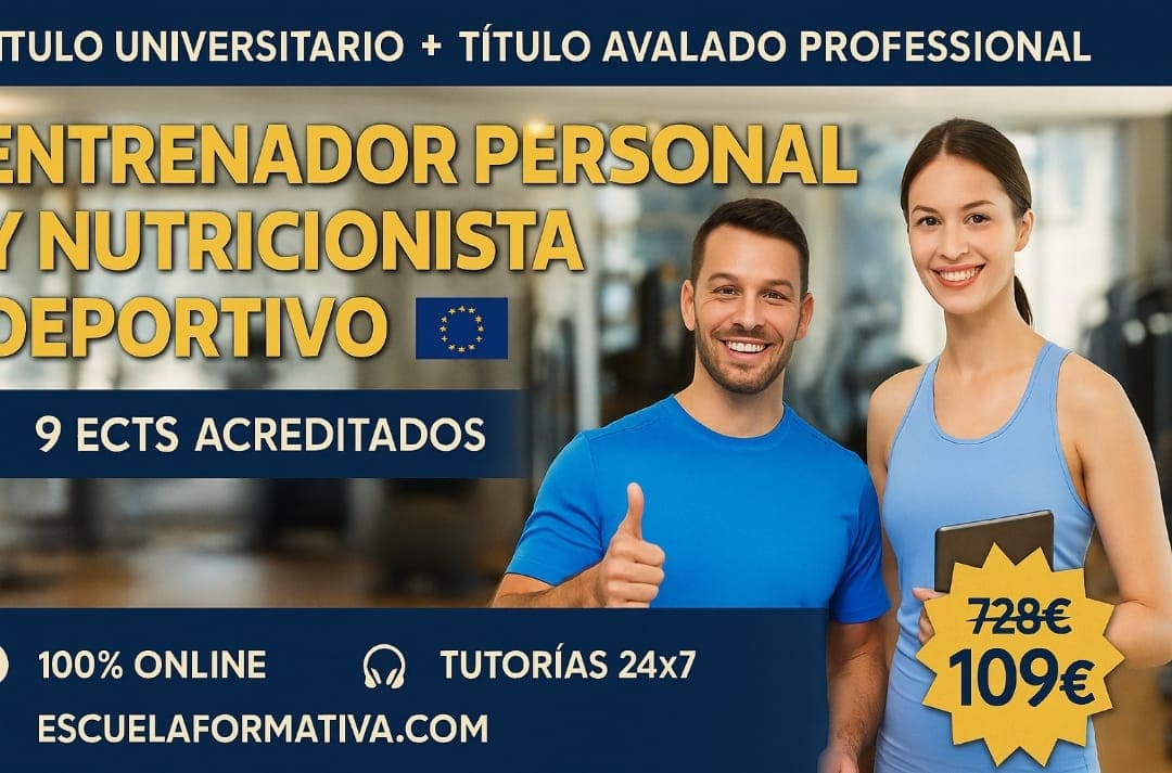 DOBLE TITULACIÓN_UNIVERSITARIA + PROFESIONAL: ENTRENAMIENTO PERSONAL Y NUTRICIÓN DEPORTIVA (9 ECTS) + ENTRENADOR PERSONAL Y NUTRICIONISTA DEPORTIVO