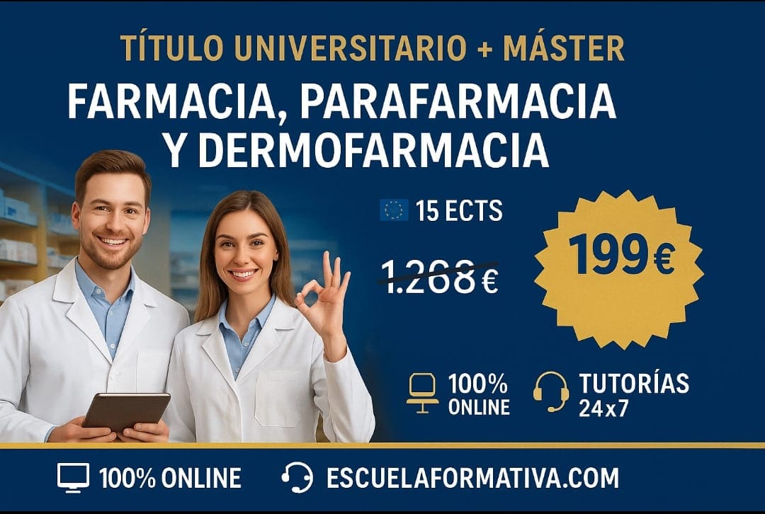 CURSO UNIVERSITARIO DE ESPECIALIZACIÓN EN FARMACIA, PARAFARMACIA Y DERMOFARMACIA AVANZADA (15 ECTS) + MÁSTER EN FARMACIA, PARAFARMACIA Y DERMOFARMACIA (DOBLE TITULACIÓN)