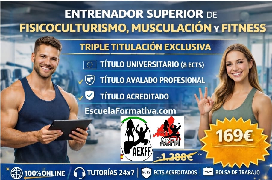 CURSO UNIVERSITARIO DE MUSCULACIÓN Y FITNESS (8 ECTS) + ENTRENADOR SUPERIOR EN FISICOCULTURISMO, MUSCULACIÓN Y FITNESS (TRIPLE TITULACIÓN)