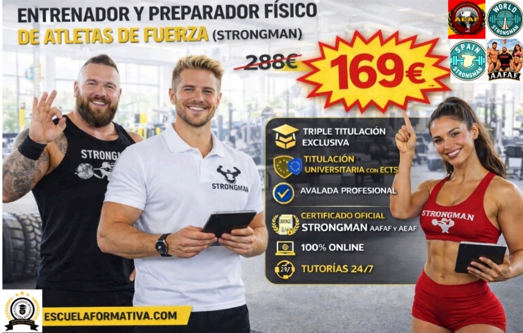 ENTRENADOR Y PREPARADOR FÍSICO DE ATLETAS DE FUERZA (STRONGMAN). TRIPLE TITULACIÓN: UNIVERSITARIA + CERTIFICADO OFICIAL STRONGMAN + PROFESIONAL