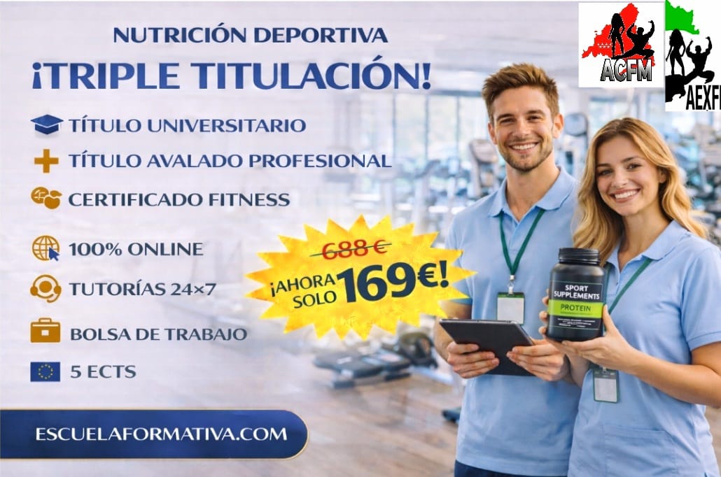NUTRICIÓN DEPORTIVA (5 ECTS) + ESPECIALISTA EN NUTRICIÓN DEPORTIVA + CERTIFICADO FITNESS: TRIPLE TITULACIÓN ~ UNIVERSITARIA + PROFESIONAL + CERTIFICACIÓN FITNESS